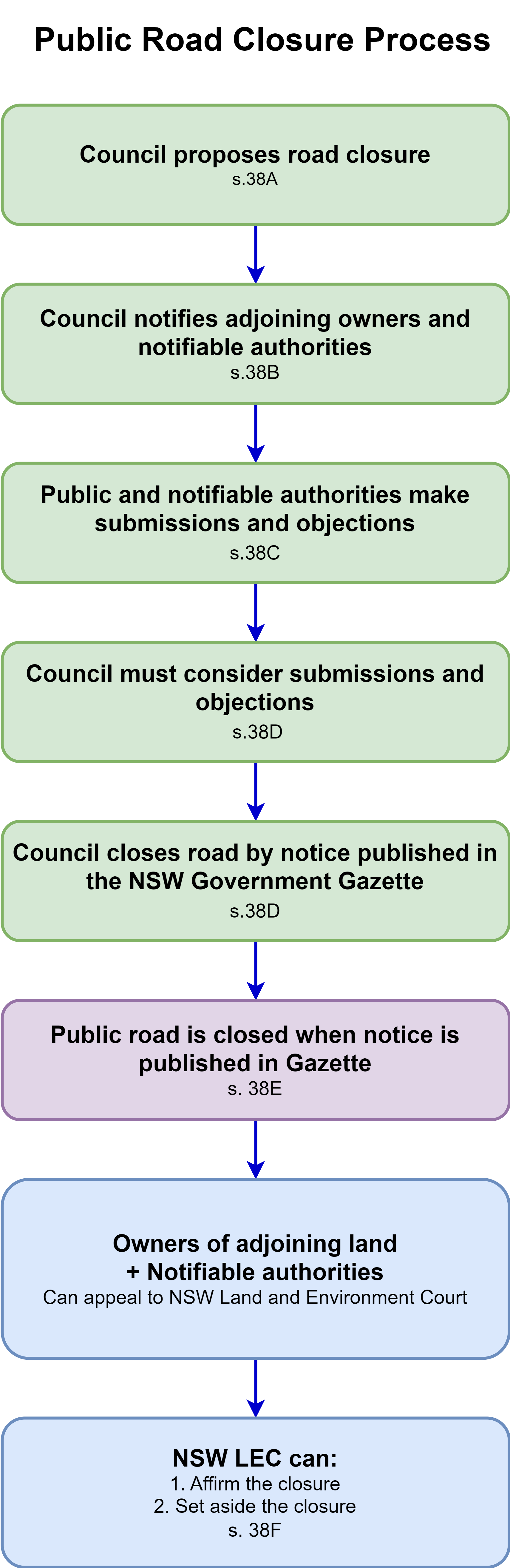 The process for road closure is set out in sections 38A to 38F of the Roads Act grouped under the heading “Closing of Roads”. The local council must be satisfied that the road is no longer required for public use, and that its closure will not compromise connectivity or reasonable land access for nearby landowners. A careful balancing of public interest and practical need is required before any closure process is initiated and the local council proposes to close the road.